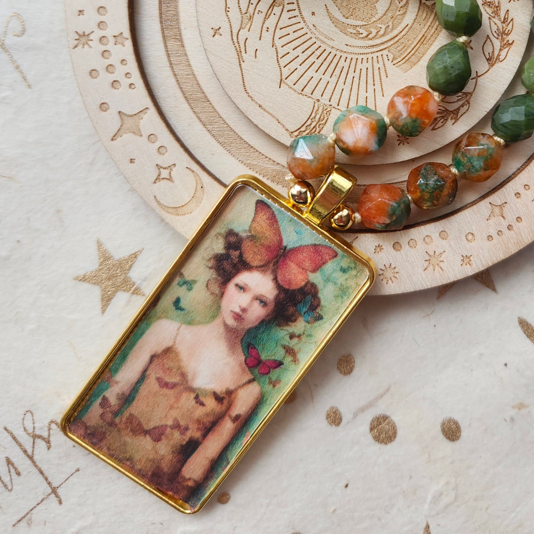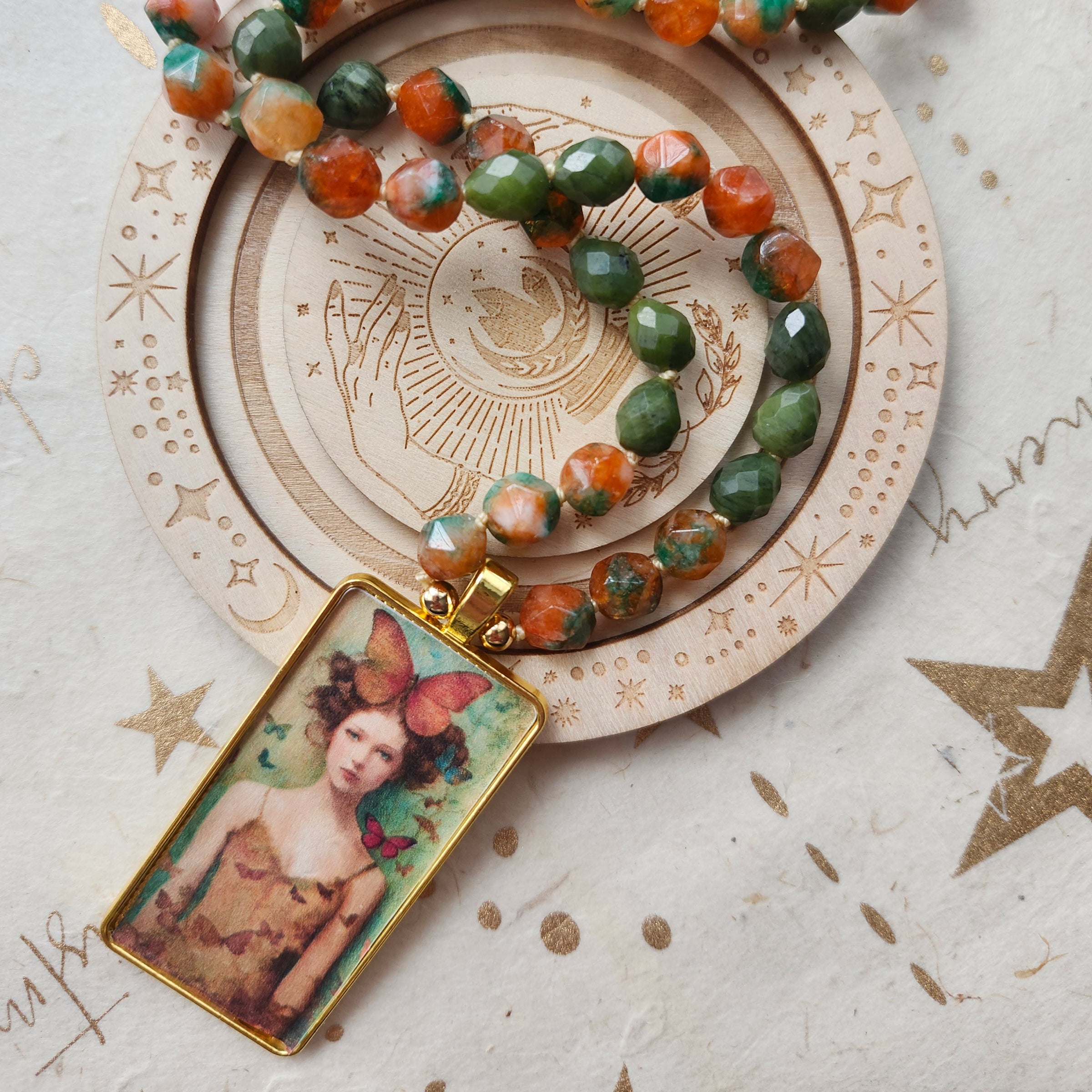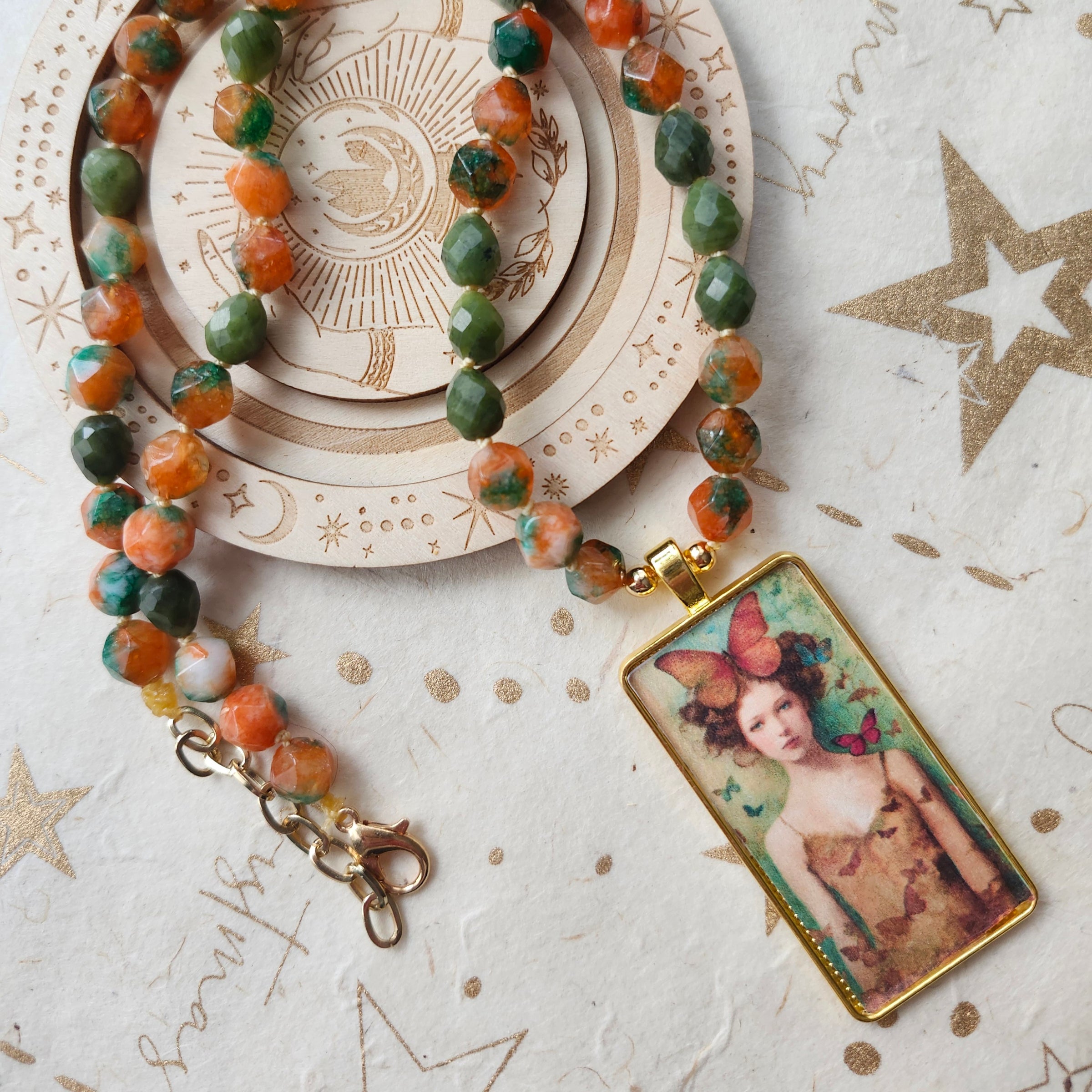 Hand-knotted with vibrant Star cut Rainbow Agate and serene Chinese Jade, this One-of-a-Kind piece celebrates nature's magic. The whimsical Butterfly Goddess pendant captures the essence of summer gardens, making it the perfect companion for bohemian souls who dance to their own rhythm. Wear it as a reminder to spread your wings and let your true colors shine.