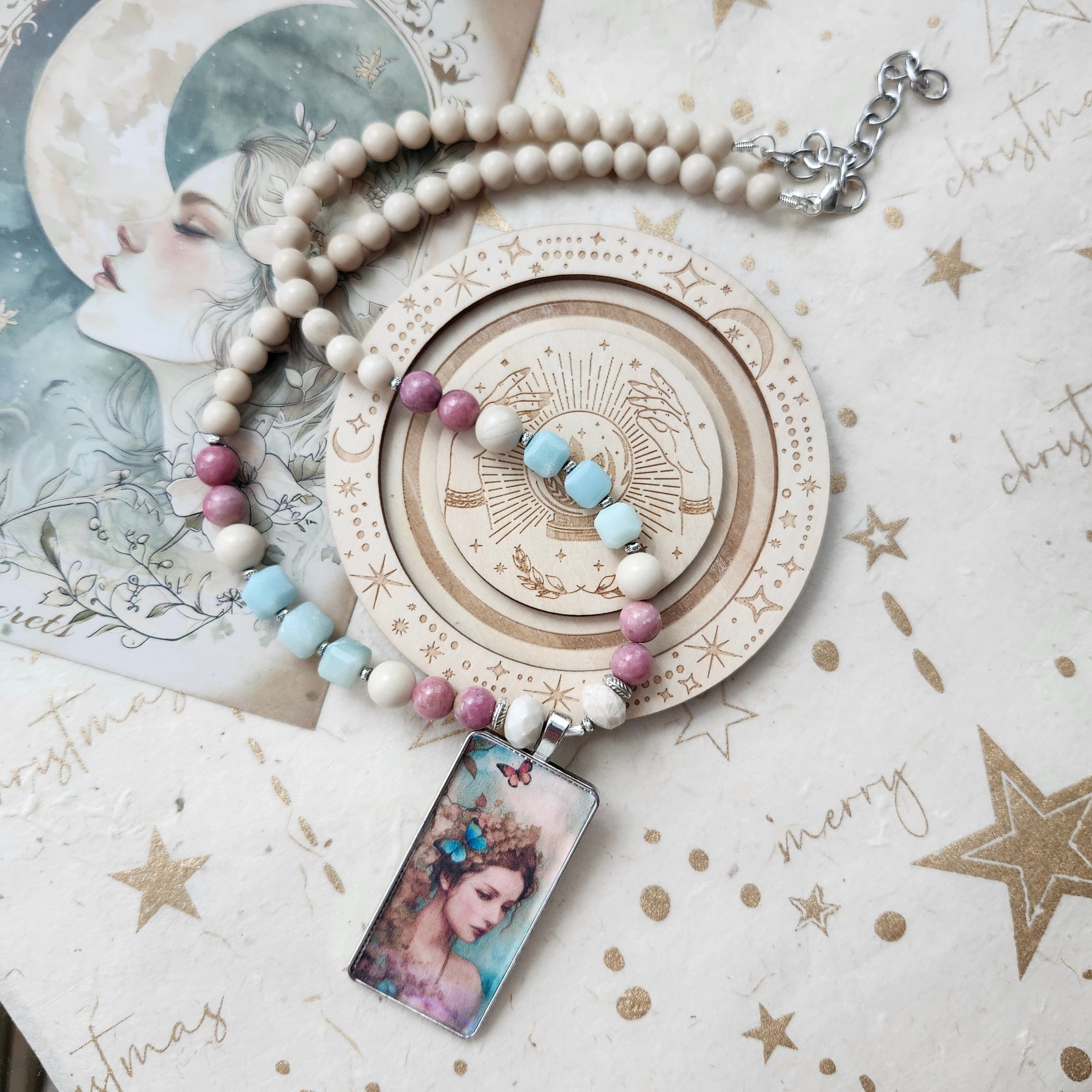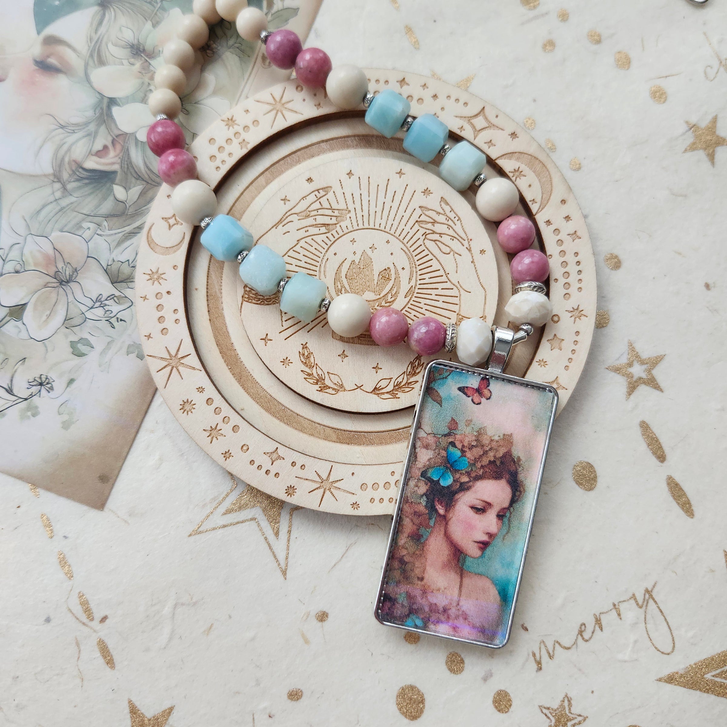 Featuring a charming art pendant depicting a maiden surrounded by wildflowers and butterflies, this statement piece combines dreamy aesthetics with carefully curated gemstones.