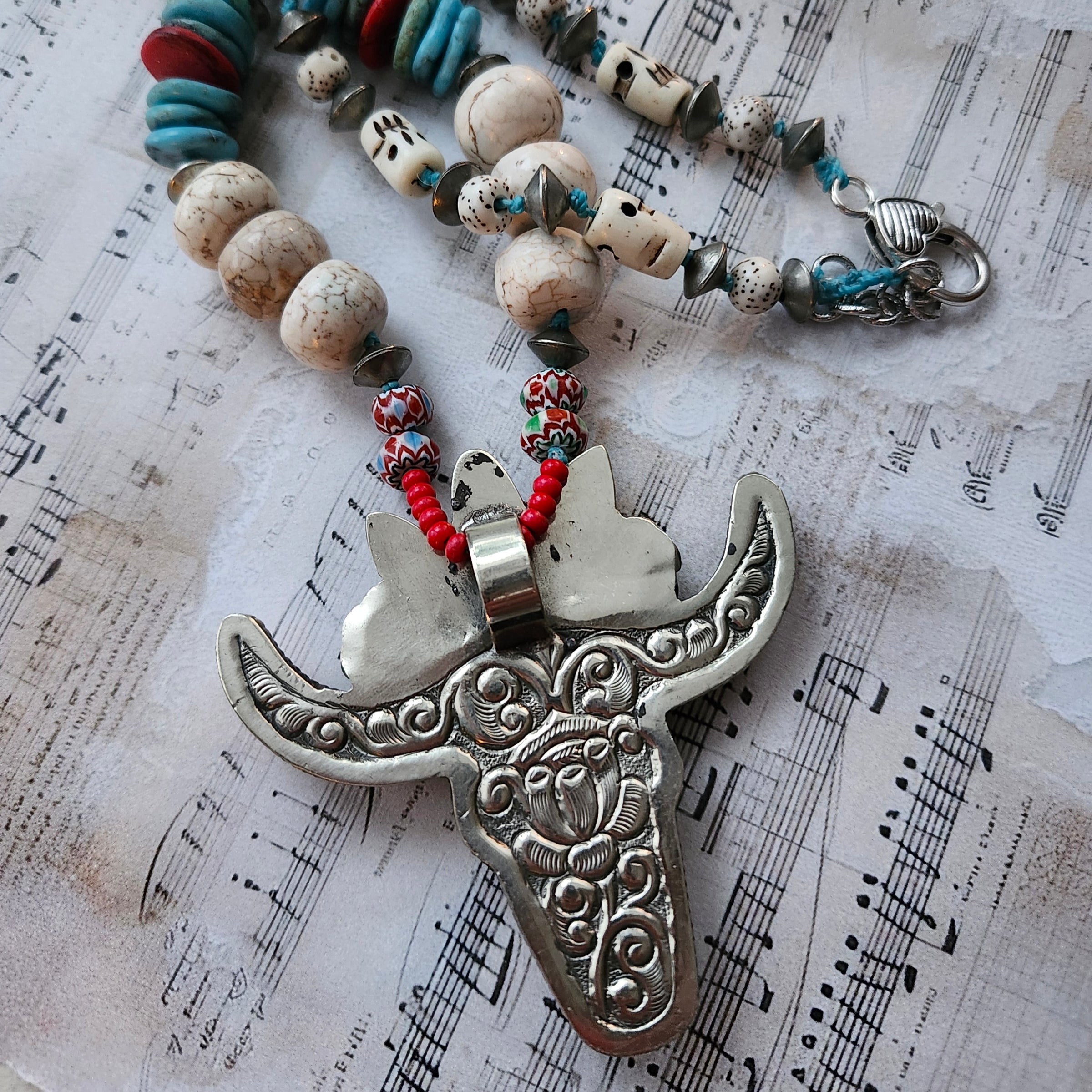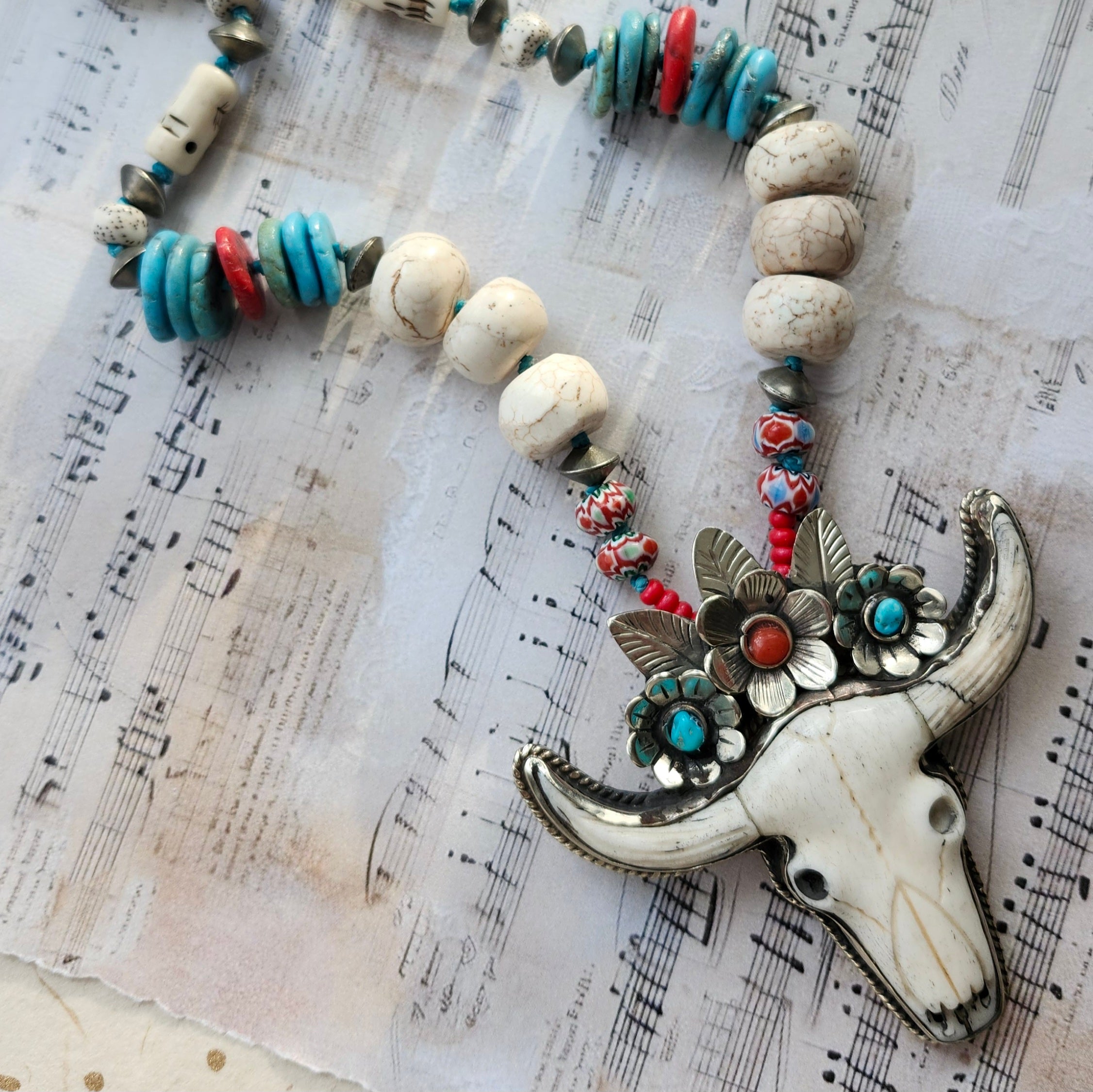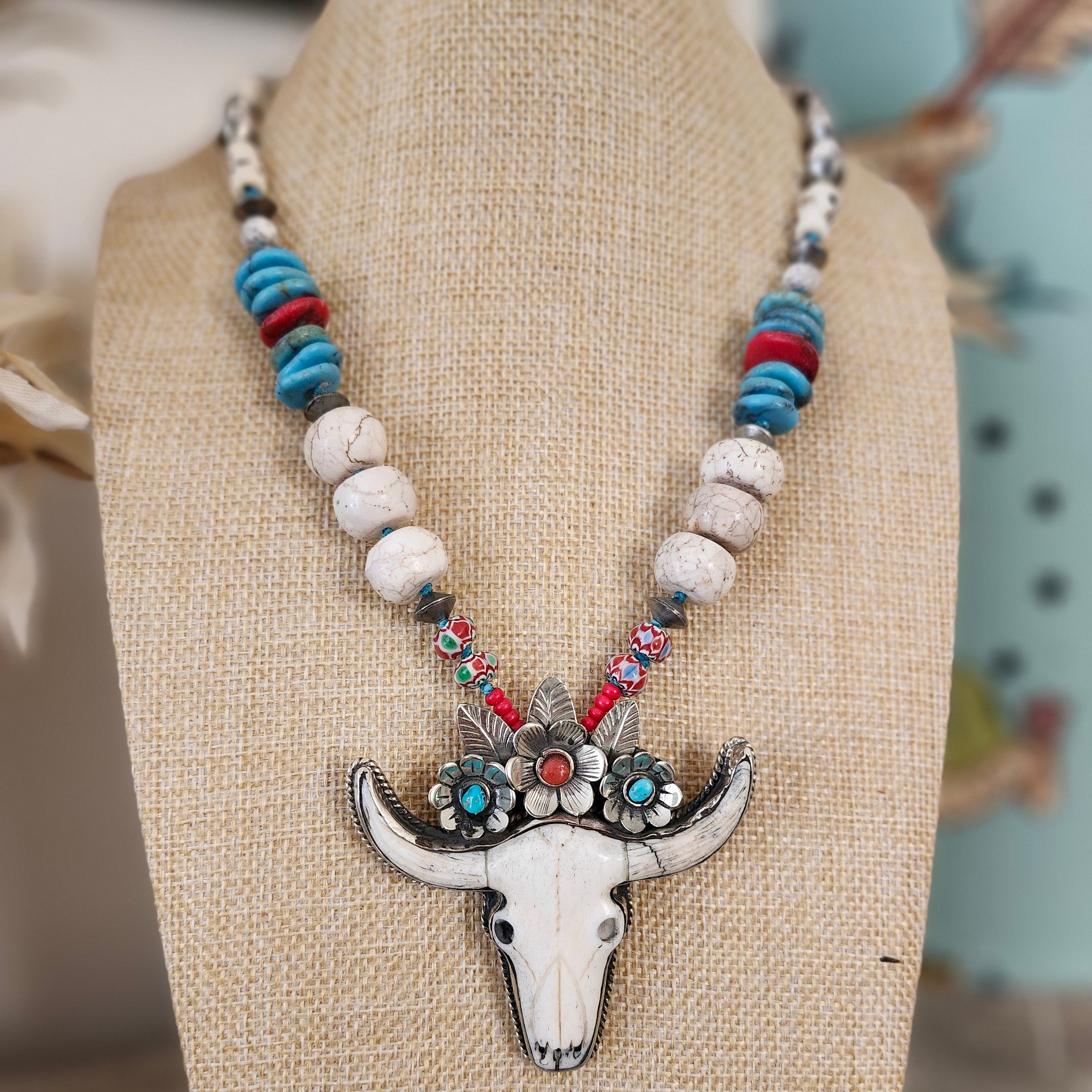 This One-of-a-Kind Southwest statement piece celebrates bold, unapologetic style. A carved bone Longhorn pendant in Tibetan Silver takes center stage, flanked by Turquoise and Coral stones in Silver flowers that pop with personality.