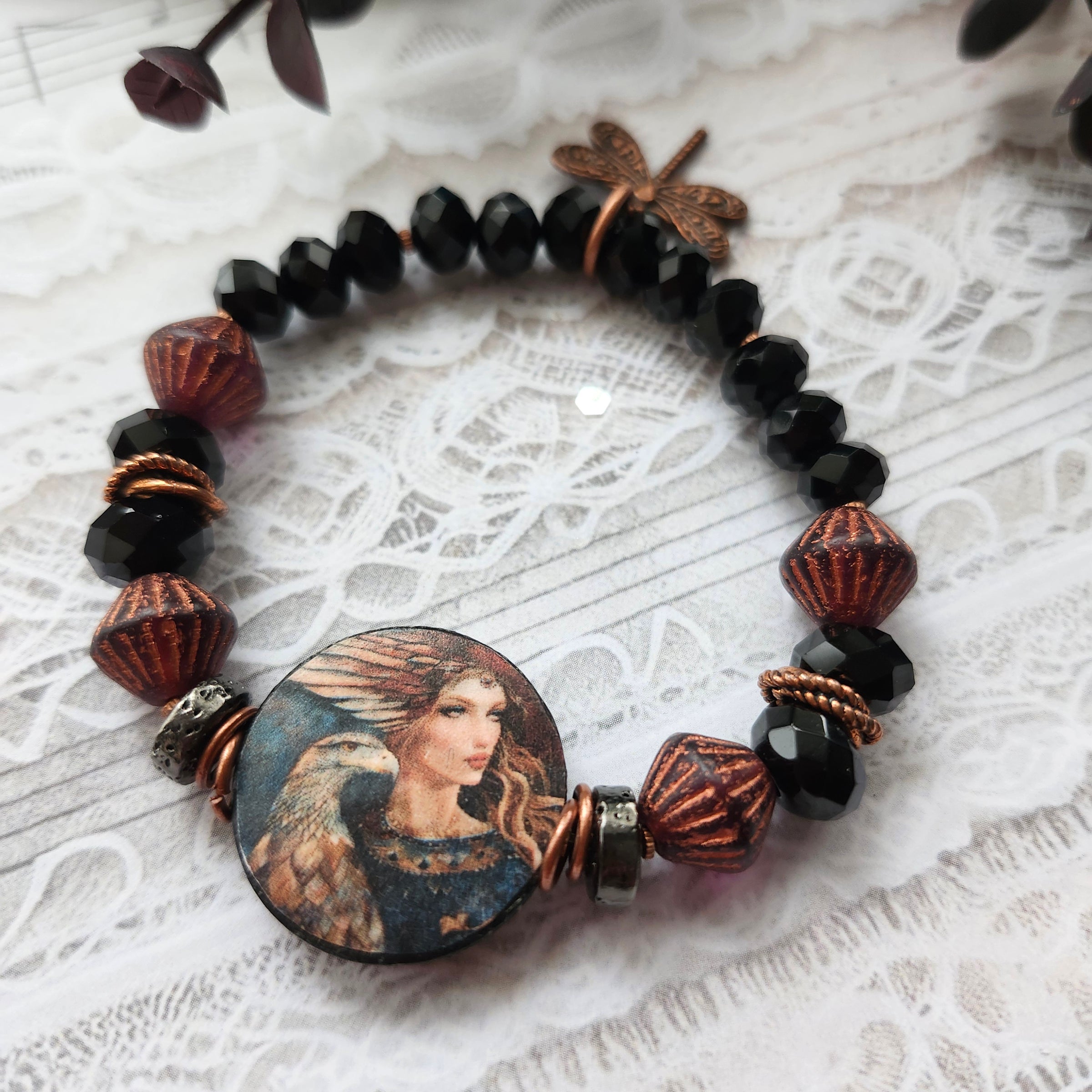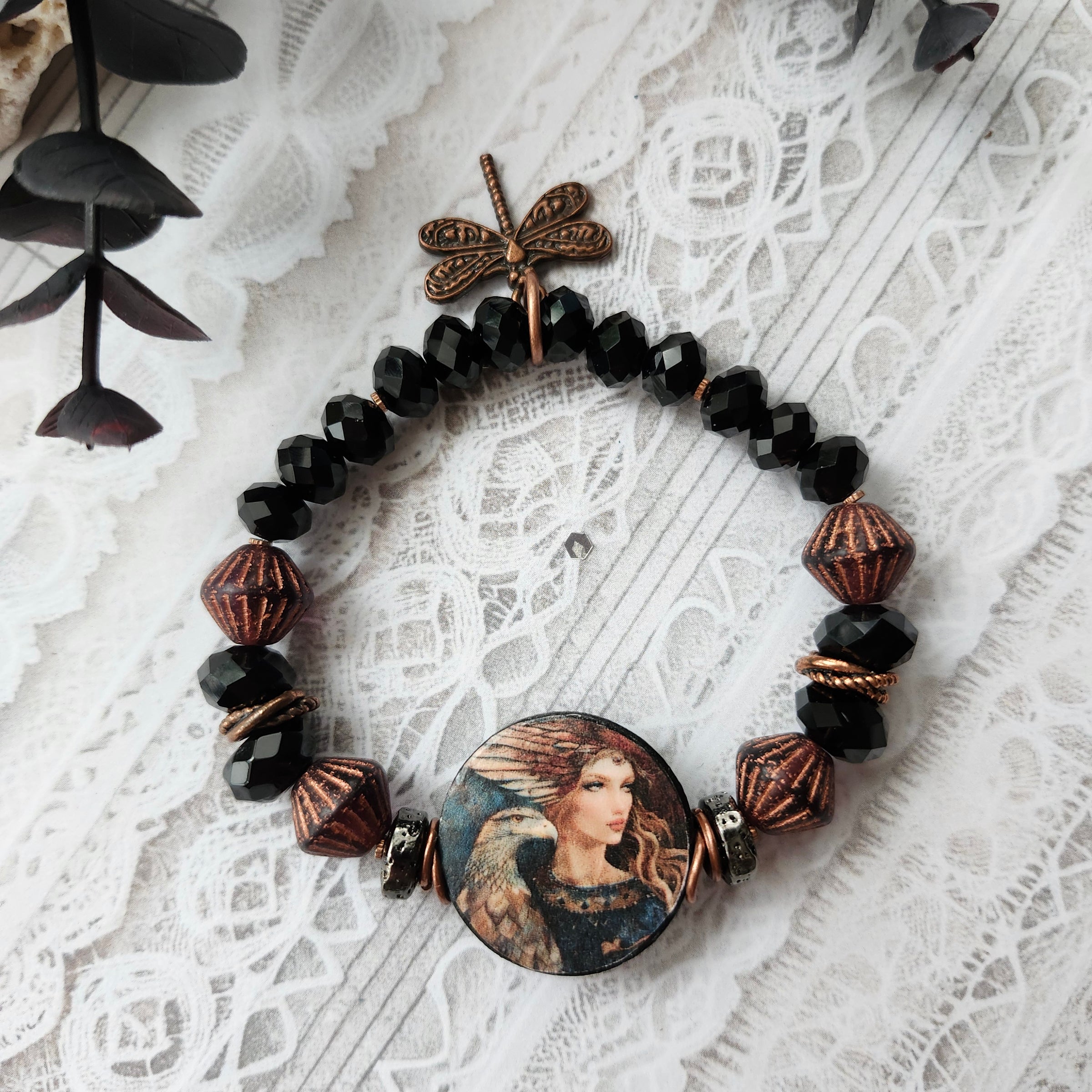 Handcrafted with striking Black Onyx gemstones, Black Plated Lava, and Czech Glass beads, this piece channels the Celtic Goddess of wisdom and strength. The centerpiece features a decoupaged focal art bead depicting Athena, complemented by a delicate Copper butterfly charm and warm Copper findings.