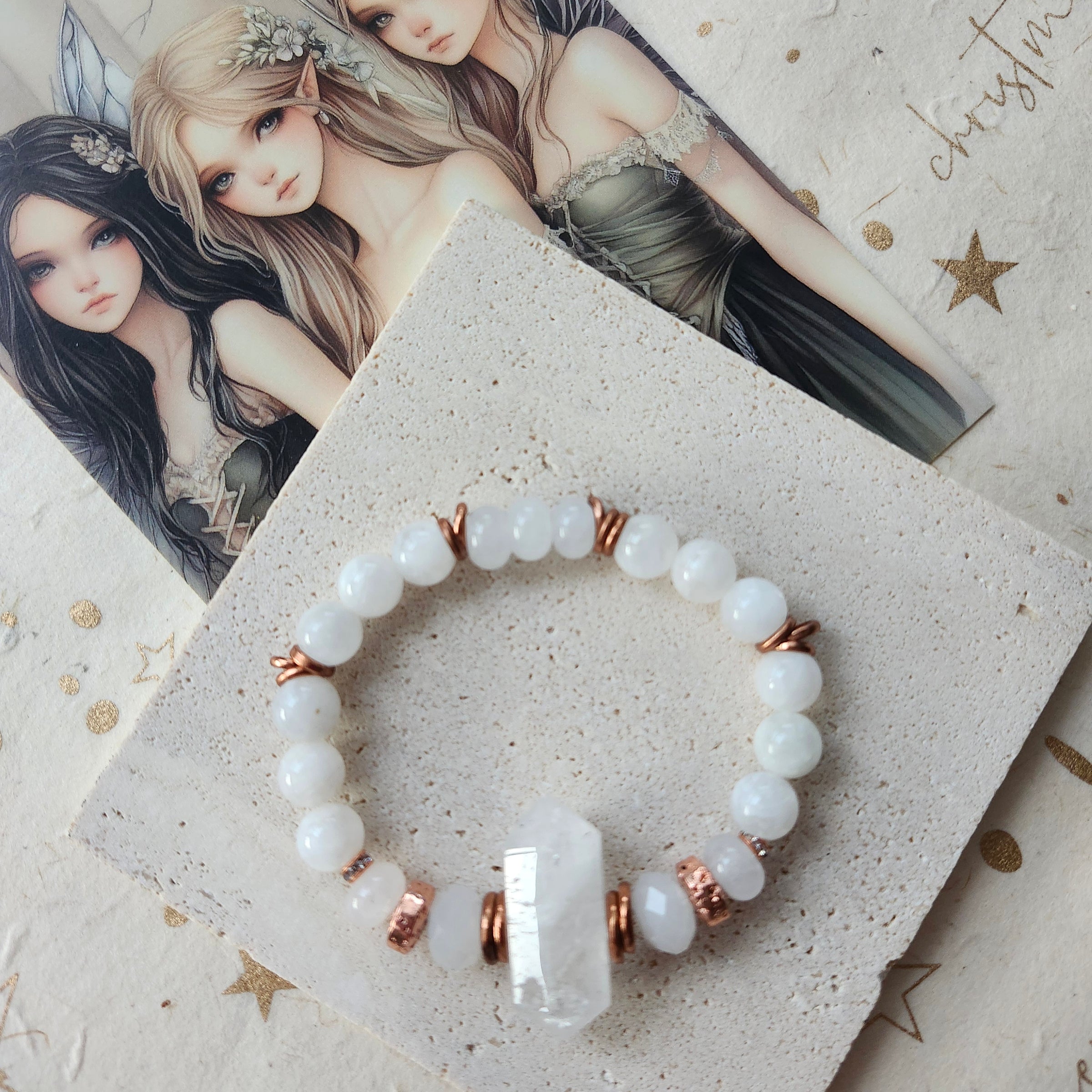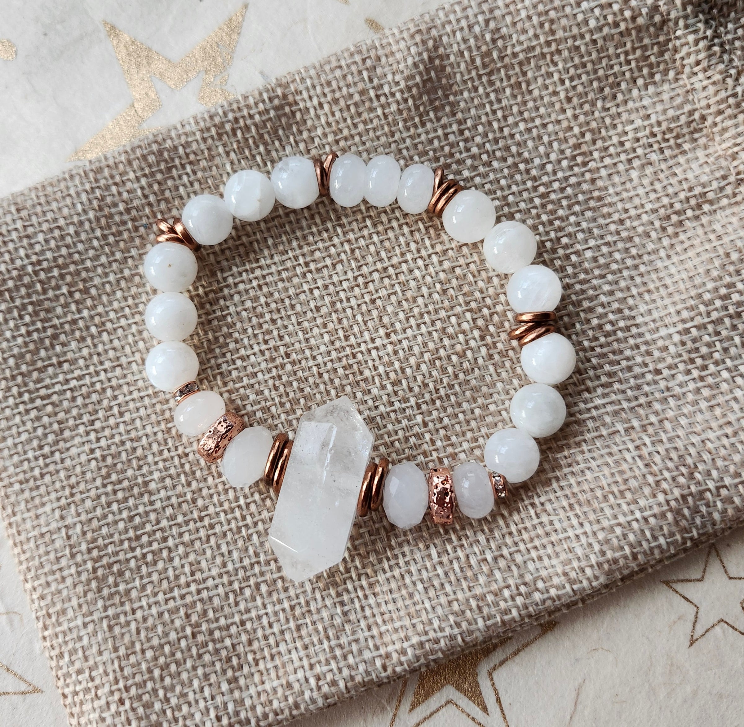 Featuring a striking Crystal Quartz stick focal paired with Natural Quartz, serene White Moonstone, and Copper-plated Lava stone, this beauty is designed to support your spiritual journey.