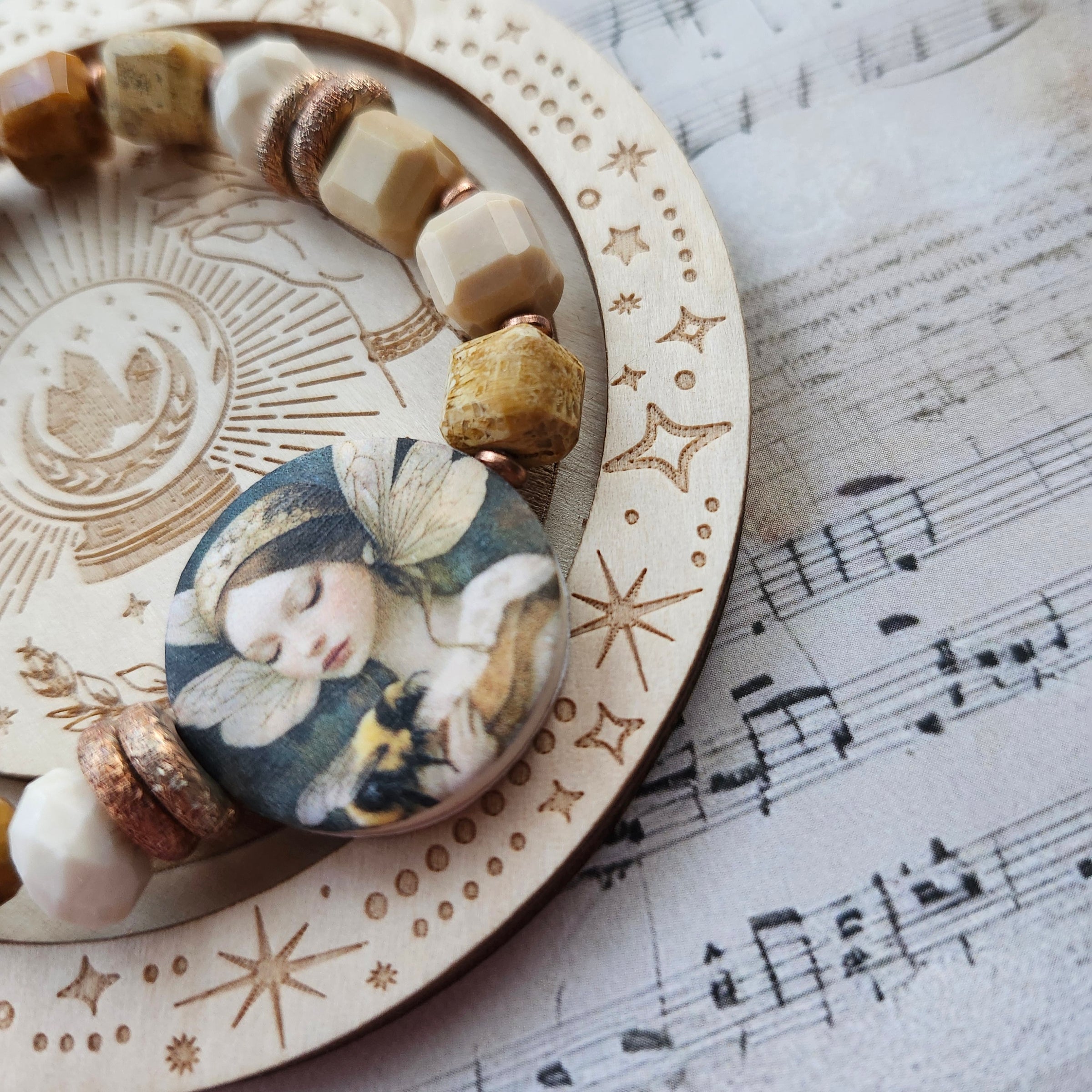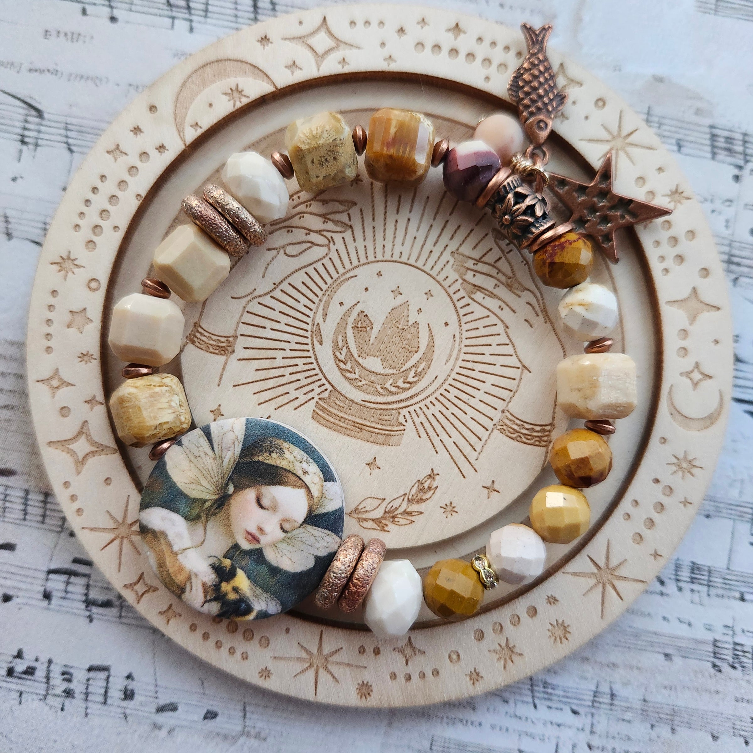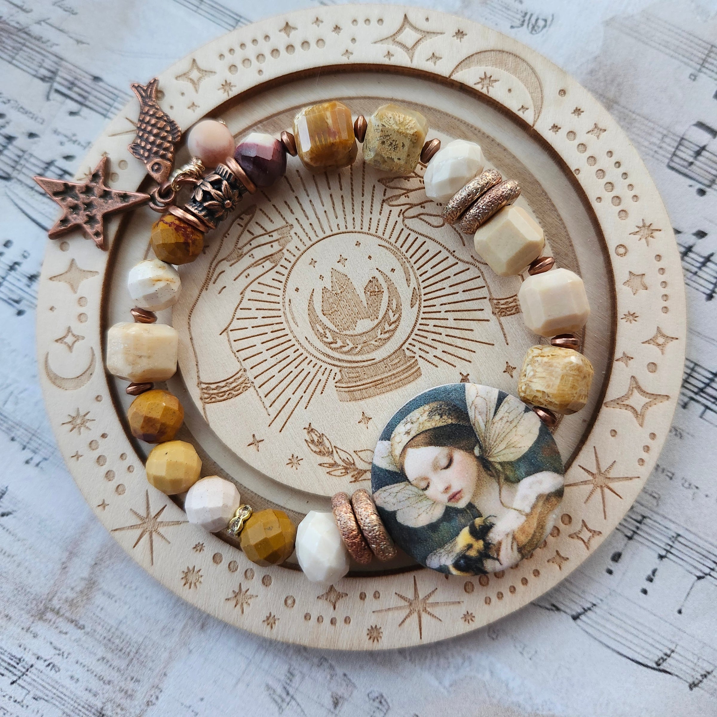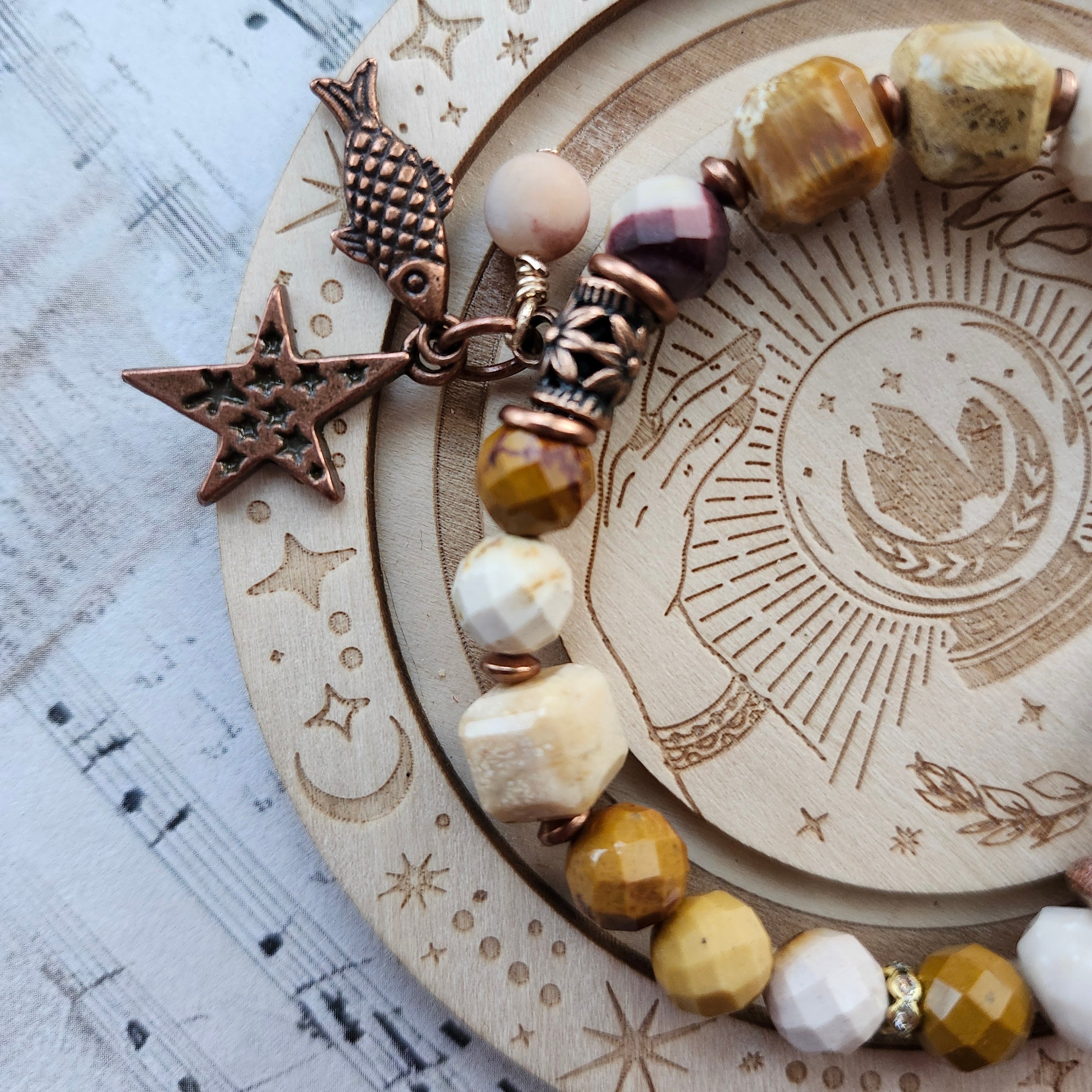 Handcrafted with earthy Riverstone Jasper, Fossil Stone, and Mookaite, this boho beauty celebrates the honey of life—pleasure, fulfillment, and the rewards that come from efforts.