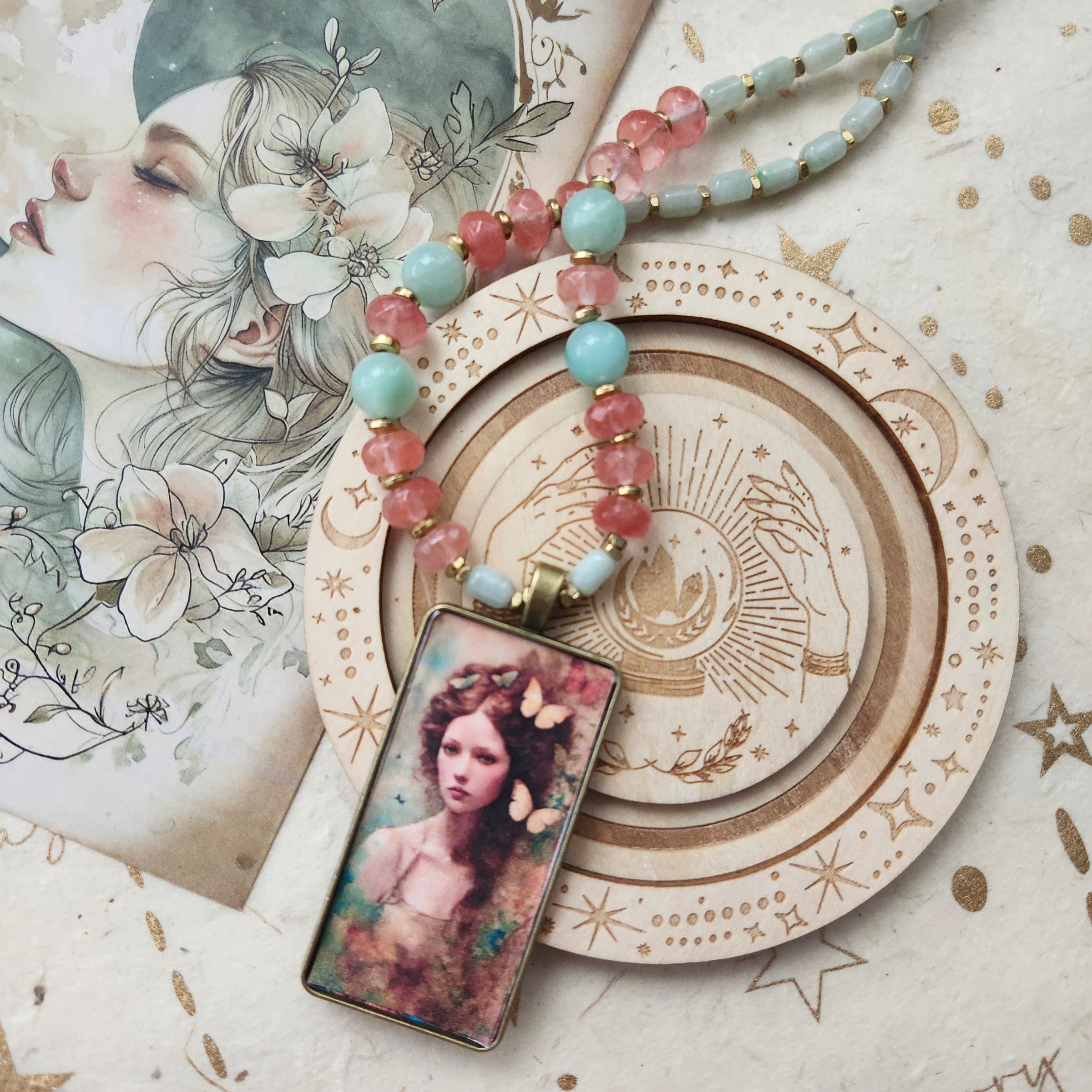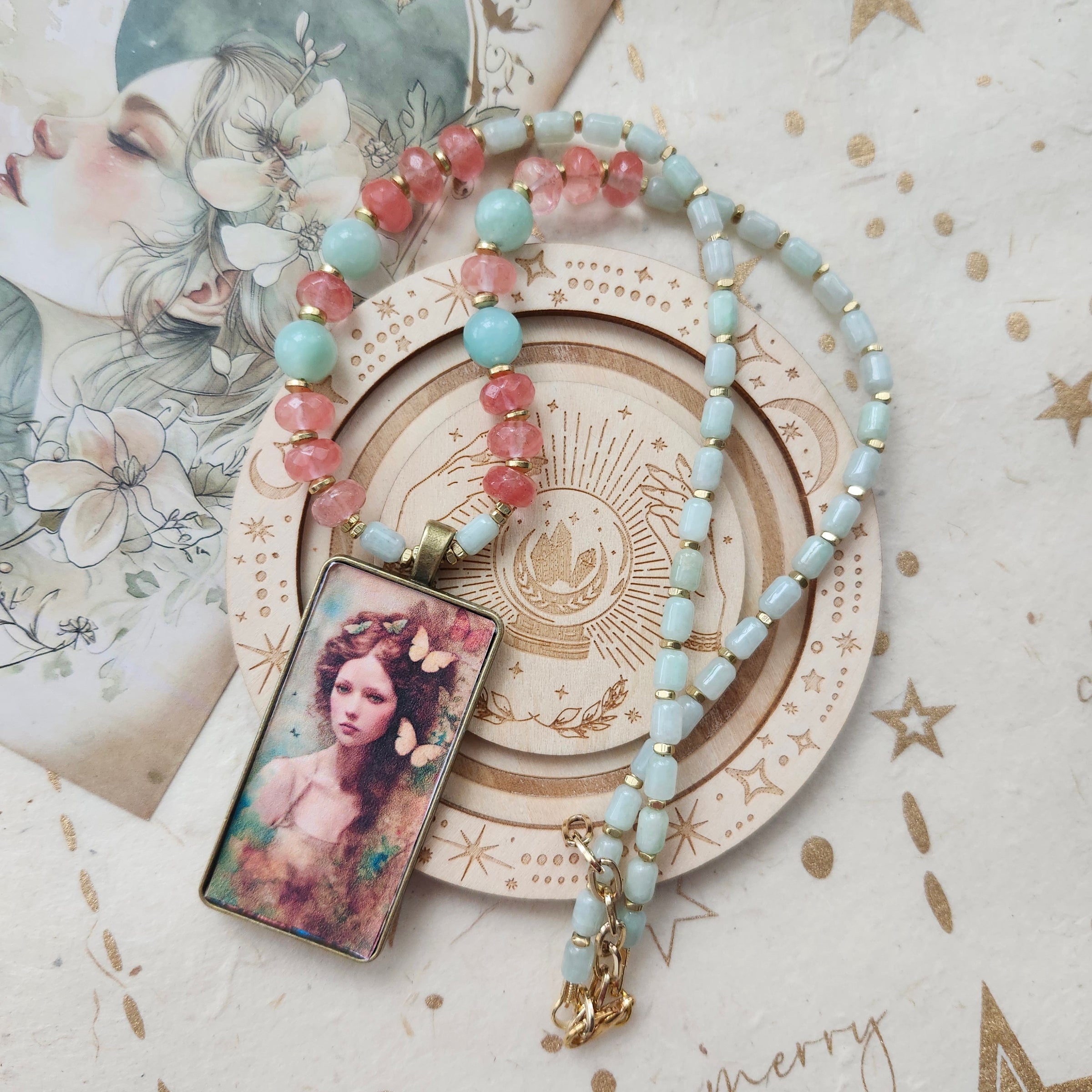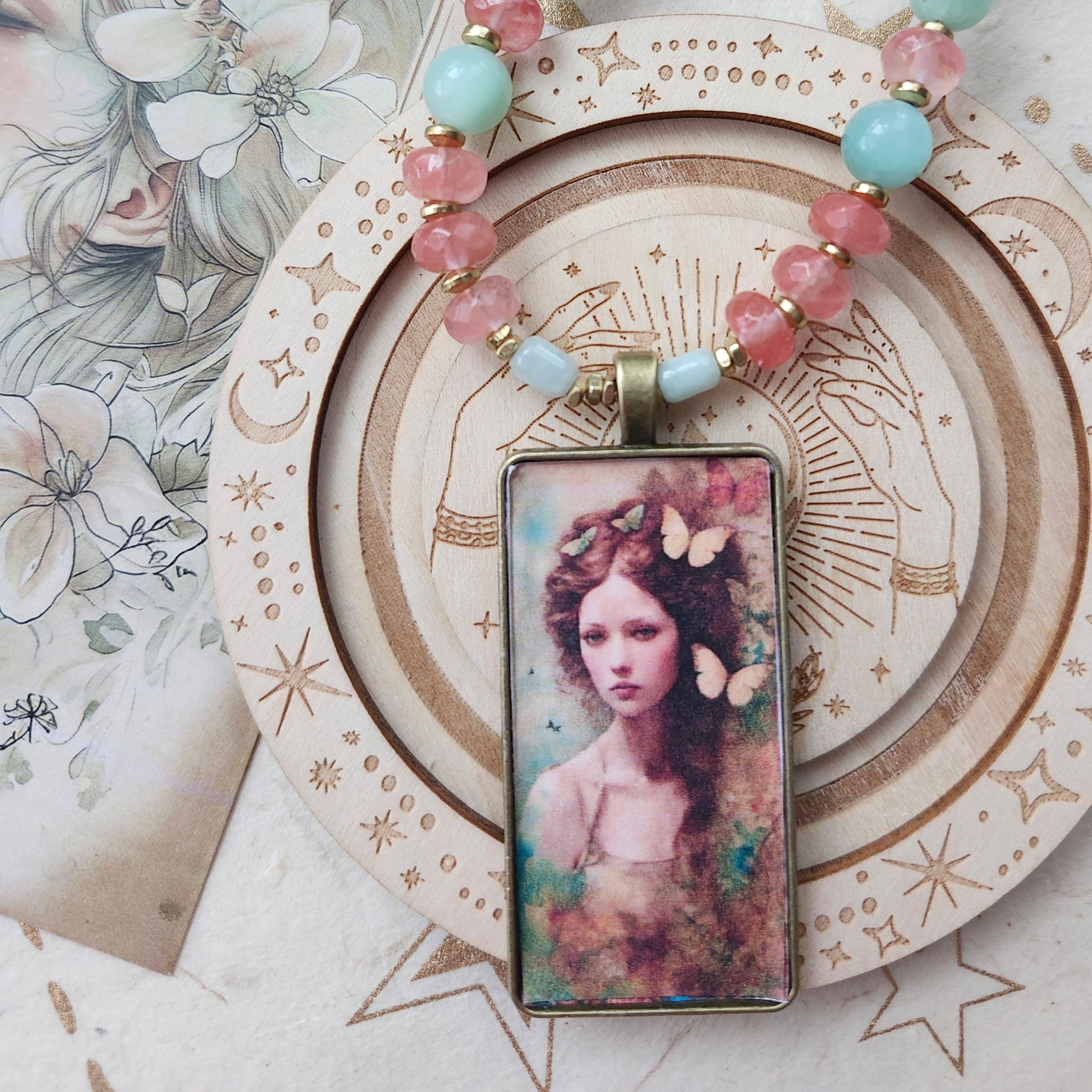 Featuring a charming art pendant depicting a maiden surrounded by wildflowers and butterflies, this statement piece combines dreamy aesthetics with carefully curated gemstones.