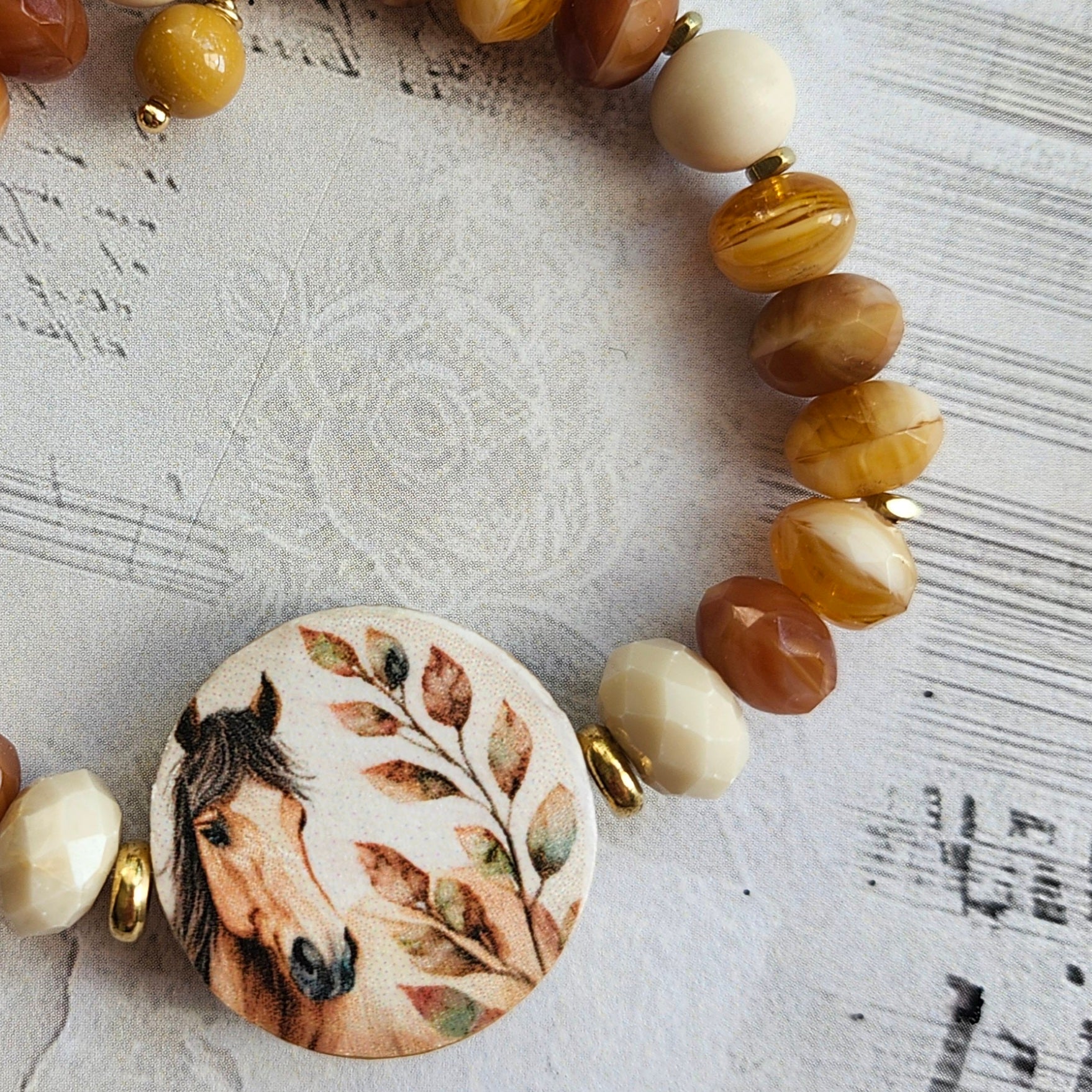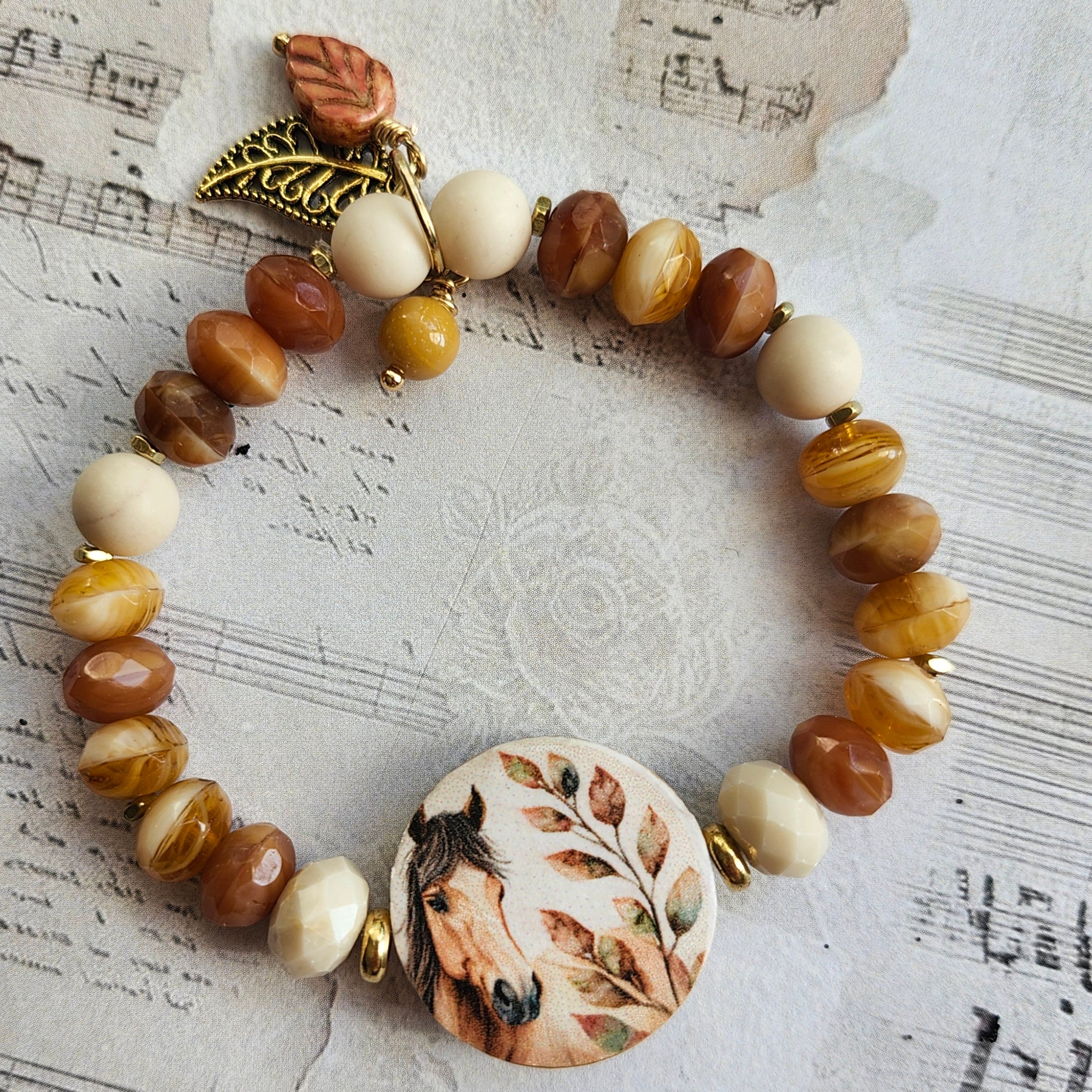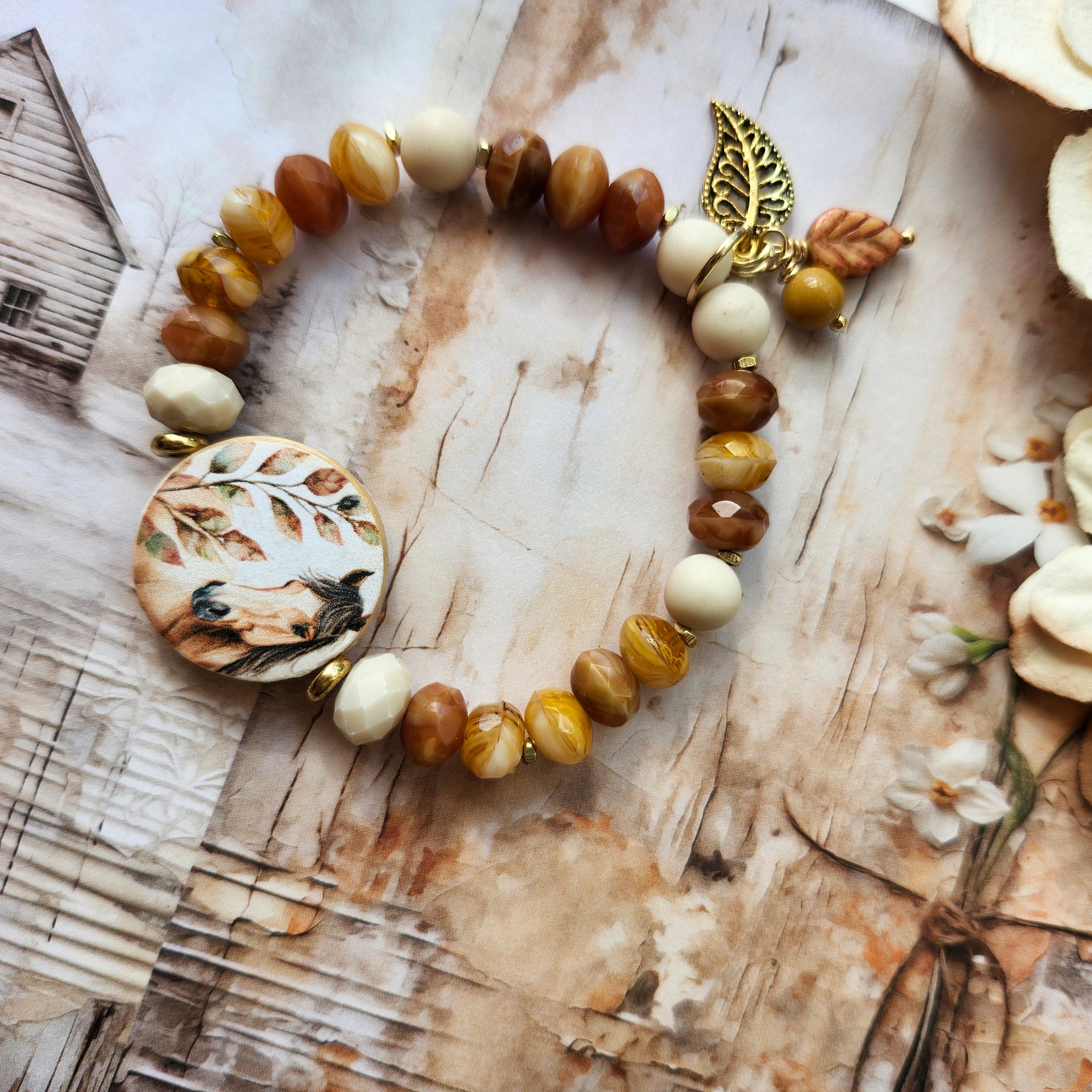 This playful stretch accessory showcases a unique Art Bead of a horse surrounded by vibrant fall leaves. Crafted with Czech glass beads, Riverstone Jasper gemstones, and charming coordinated accents, it captures the season’s changing colors in every detail.