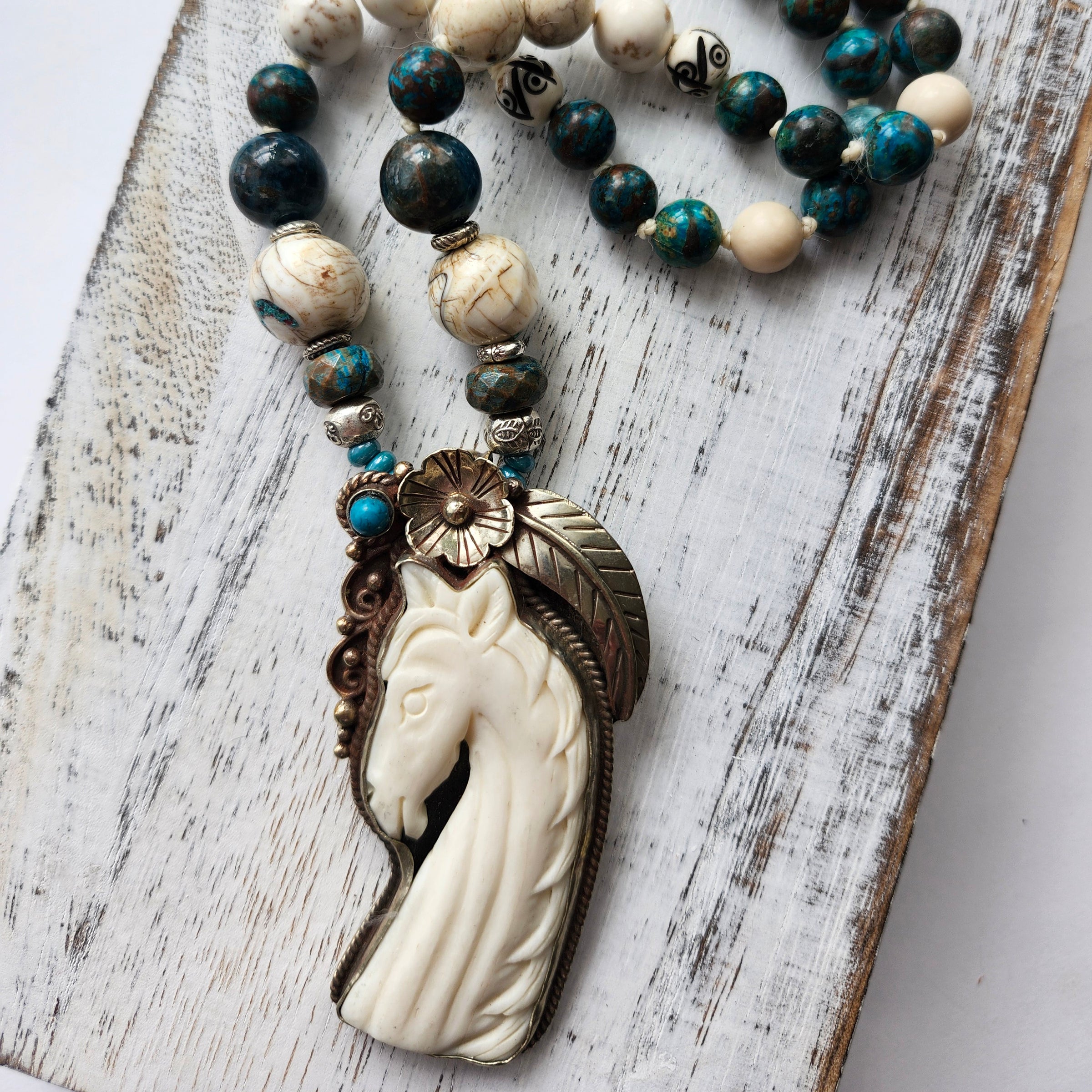 Chrysocolla, Magnesite, African bone beads, Riverstone Jasper, and Hill Tribe Silver spacers create a rich tapestry of color and texture that tells its own story. Perfect for horse lovers and free spirits who refuse to blend in!