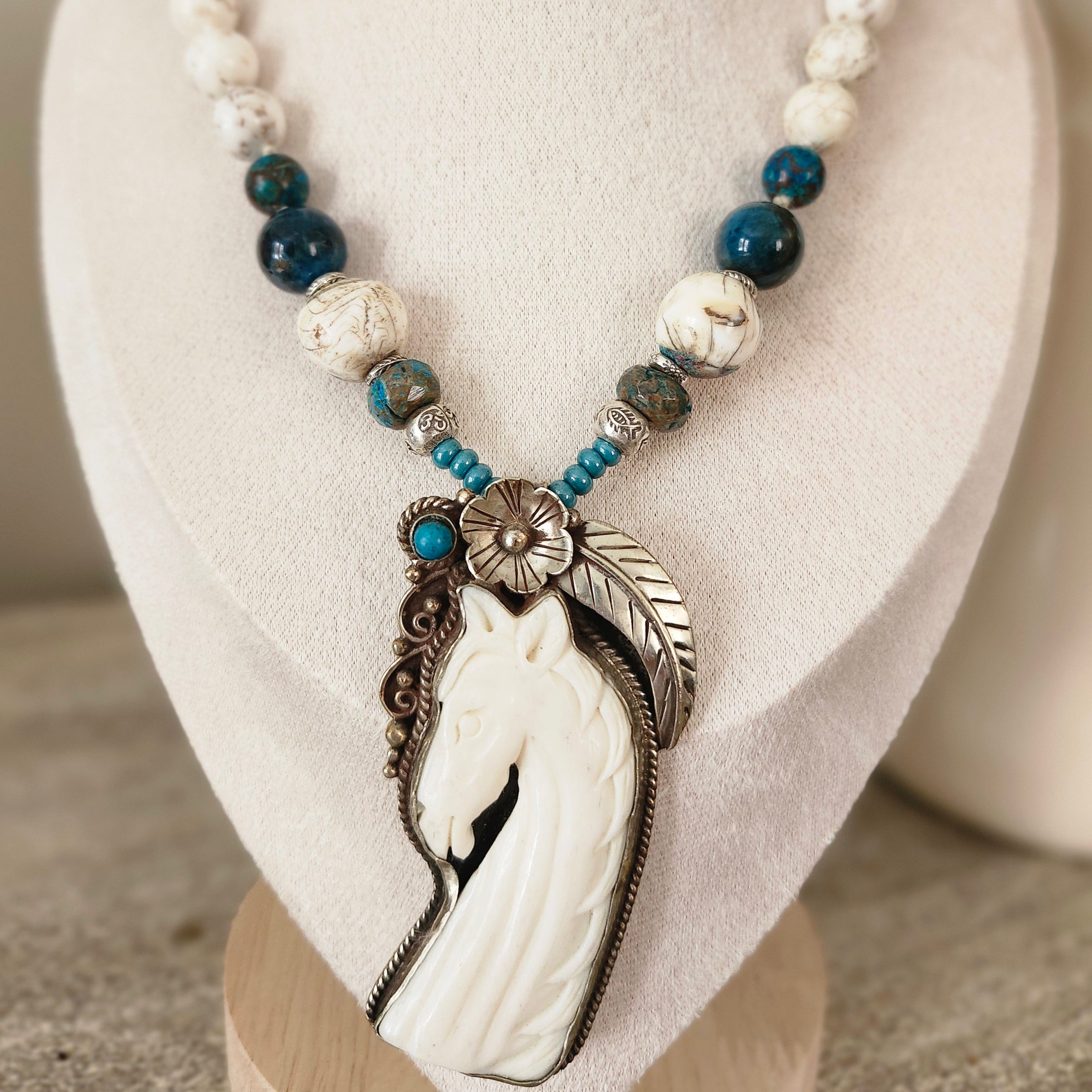 Featuring a striking Artisan Tibetan Silver and carved Bone Horse pendant as the showstopper, this statement piece weaves together Southwestern charm with global artisan treasures. Created in Tibetan Silver, the back features beautiful, intricate designs to compliment the front.