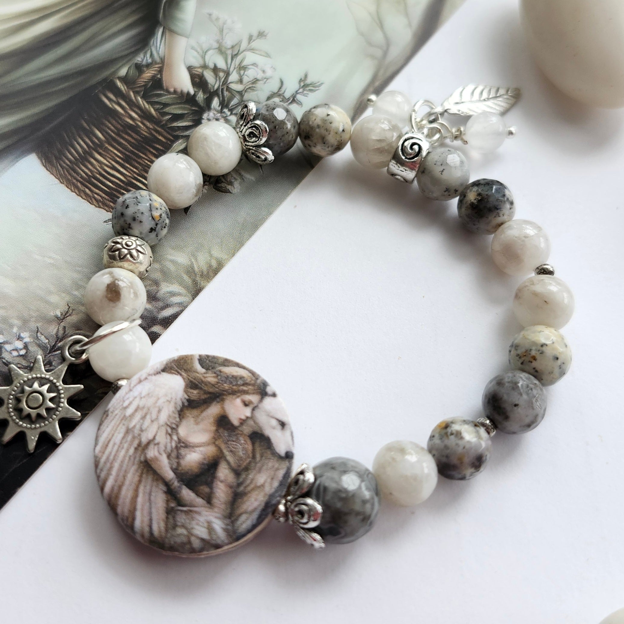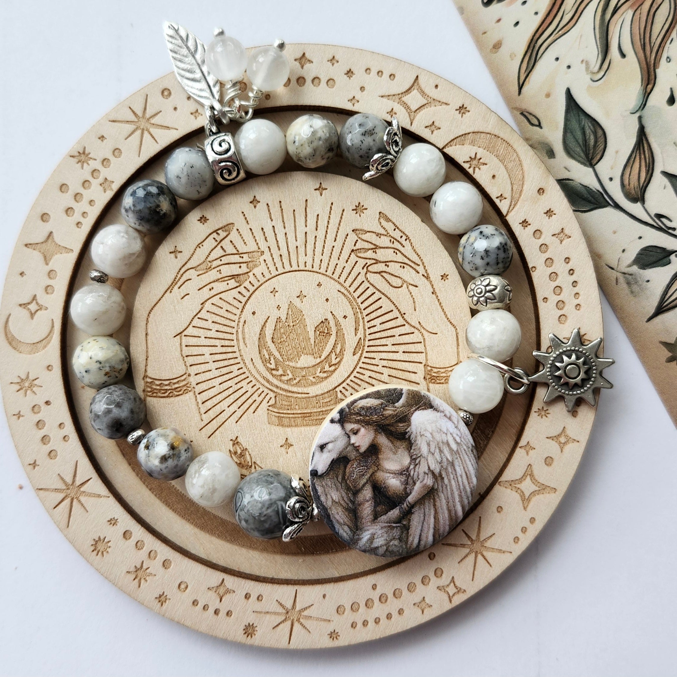 Featuring a striking focal art bead showcasing Morrigan alongside her loyal wolf companion, this piece channels the mystical energy of the wolf—a symbol of loyalty, instinct, and untamed spirit.