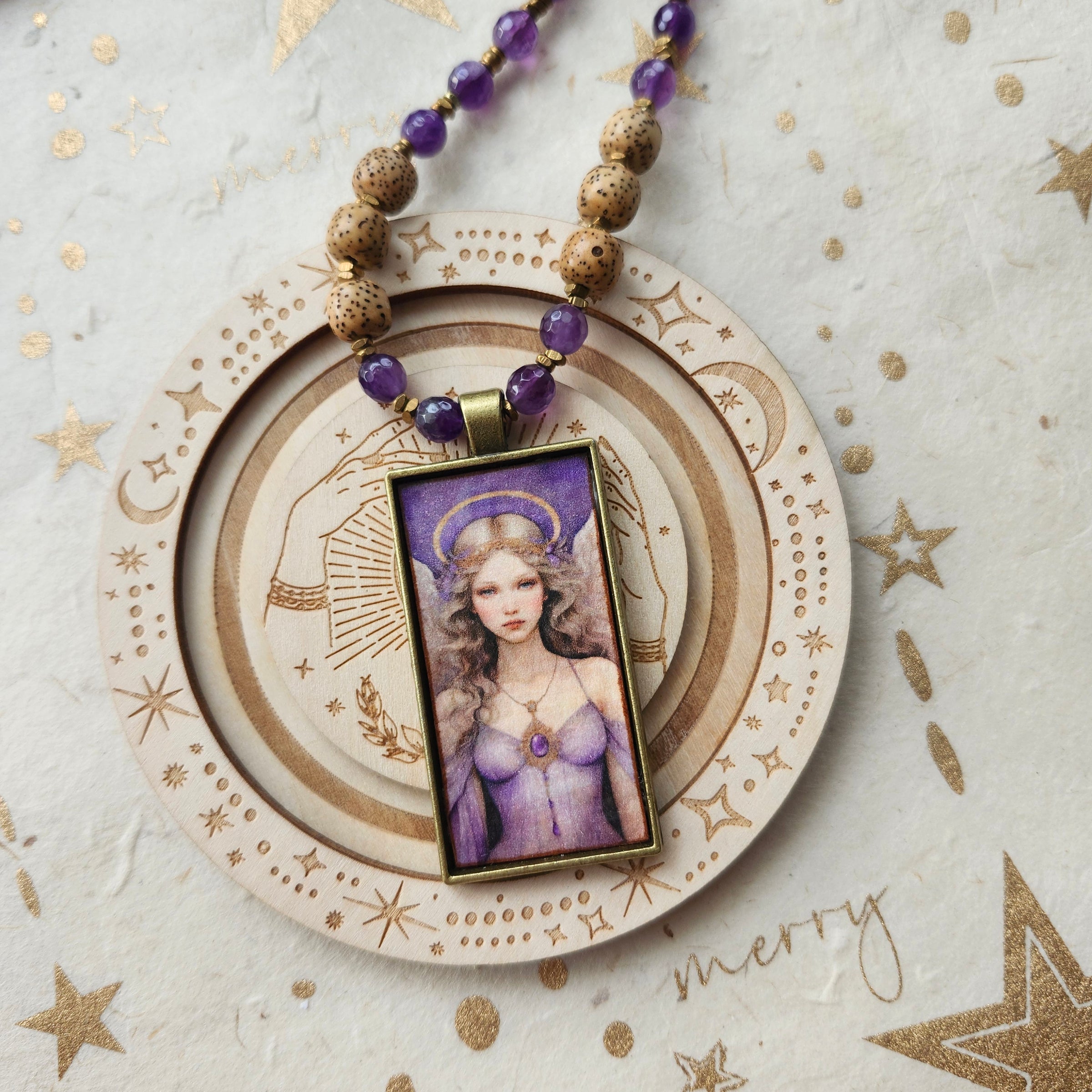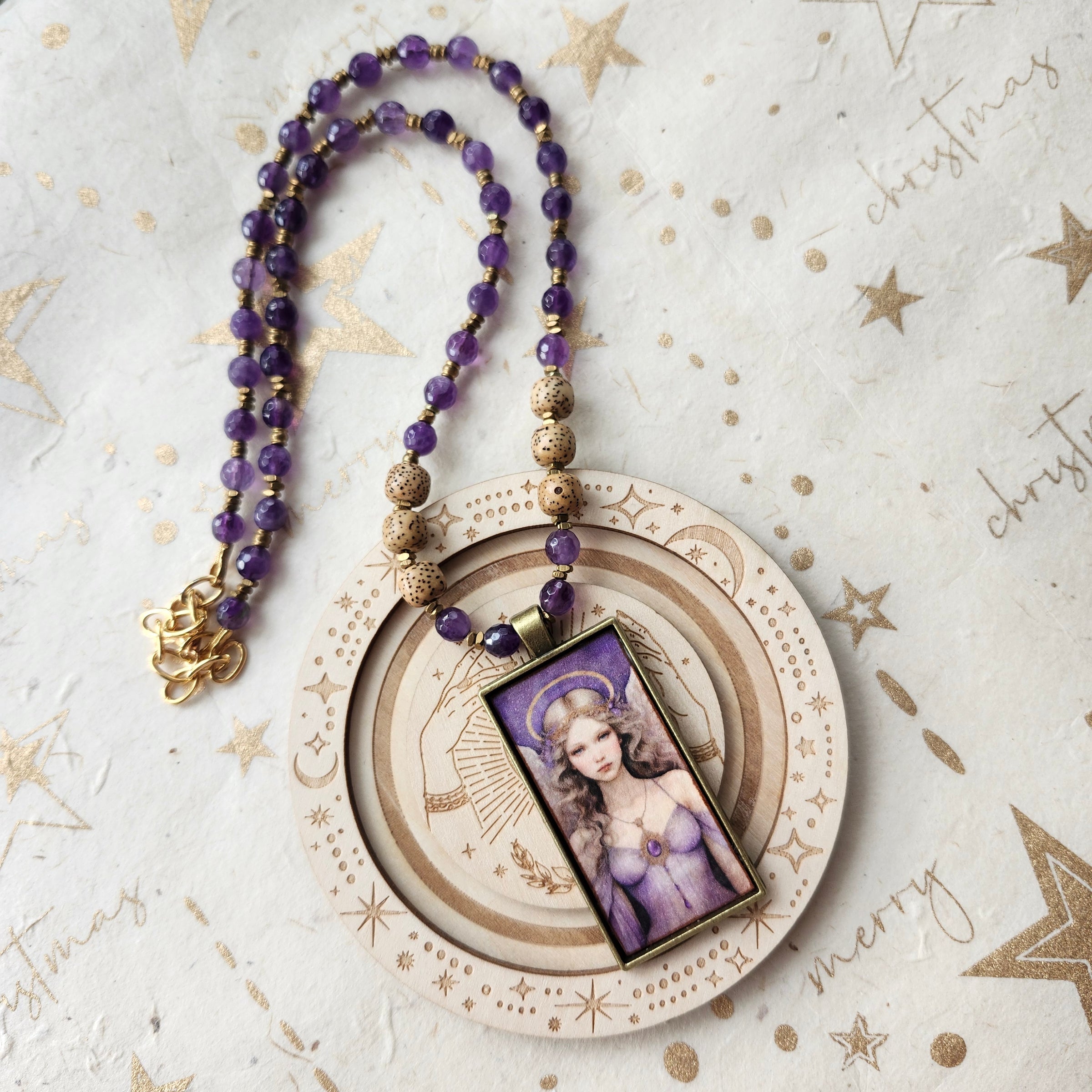 Featuring an Angel of Intuition Art Pendant,  faceted Amethyst gemstones, Bodhi beads, and Gold Bali spacers, this spiritual accessory soothes the mind and promotes tranquility.