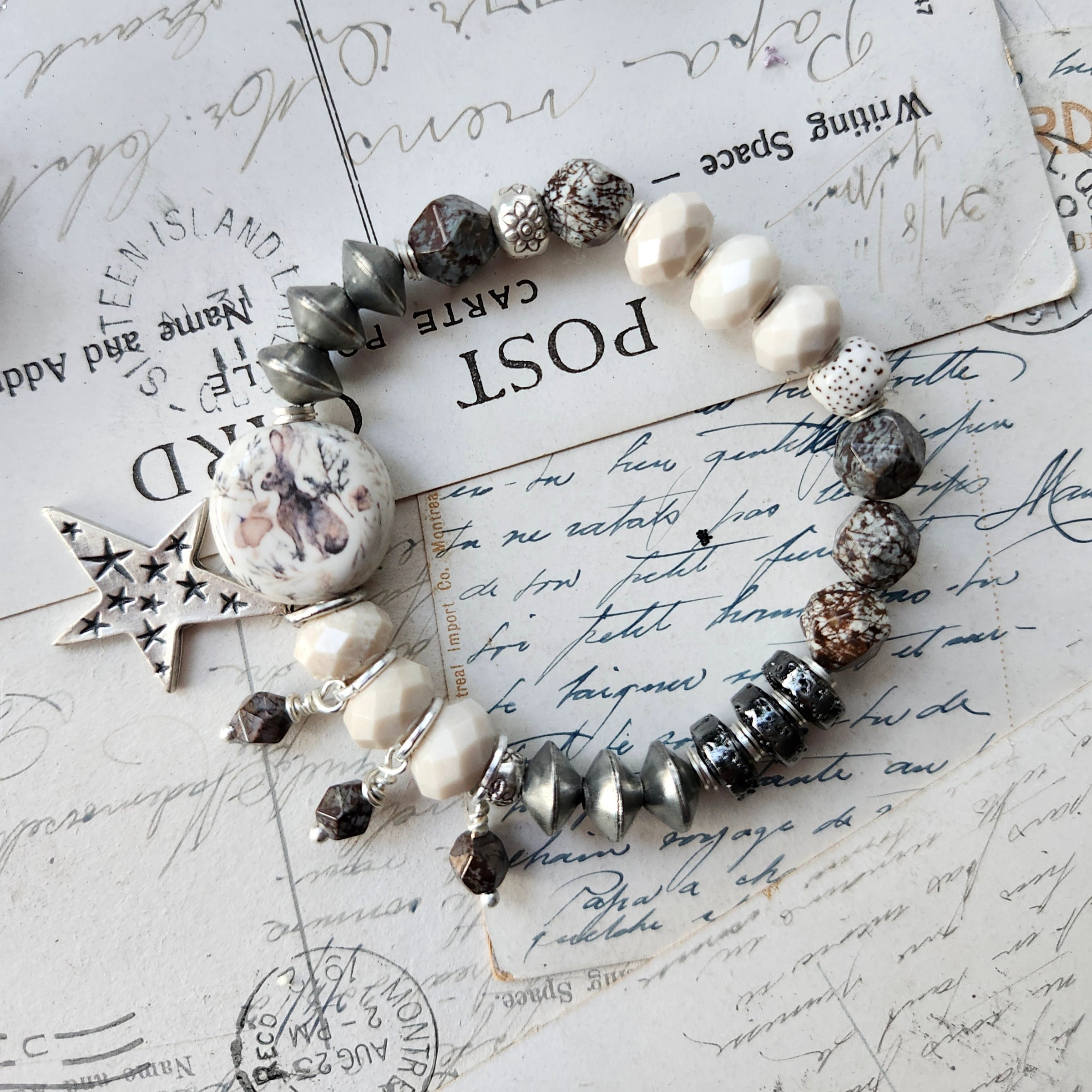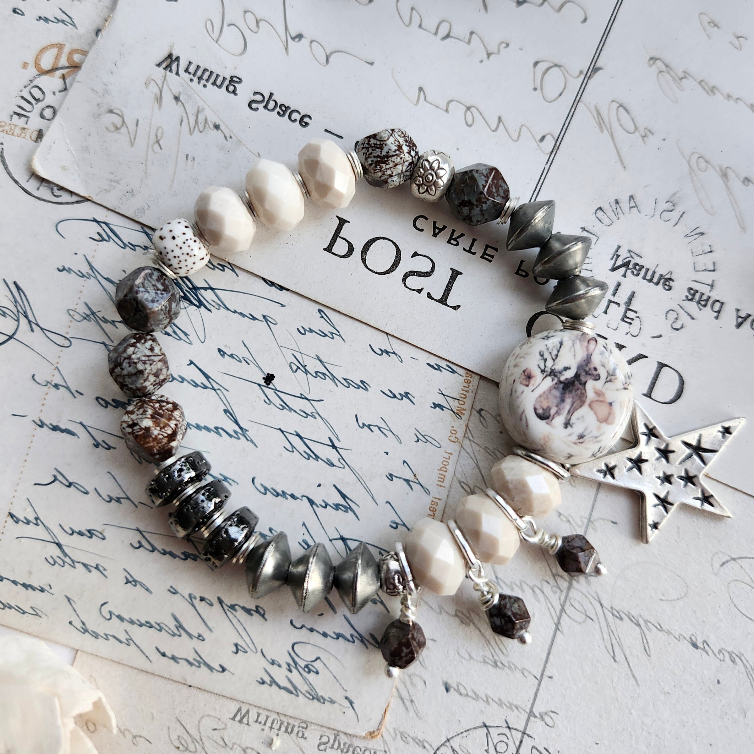 "First Snow" - Inspired by the delicate beauty of a first snow, this One-of-a-Kind bracelet captures that magical moment when earth peeks through pristine white. Handcrafted with a stunning Ceramic focal bead surrounded by genuine gemstones and Silver accents, it features artisan beads sourced from seven different countries.
