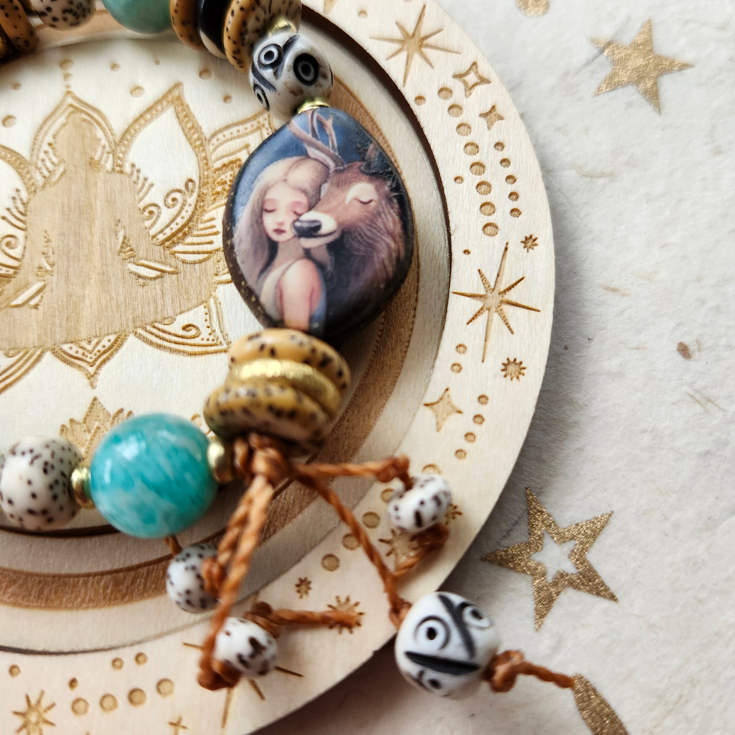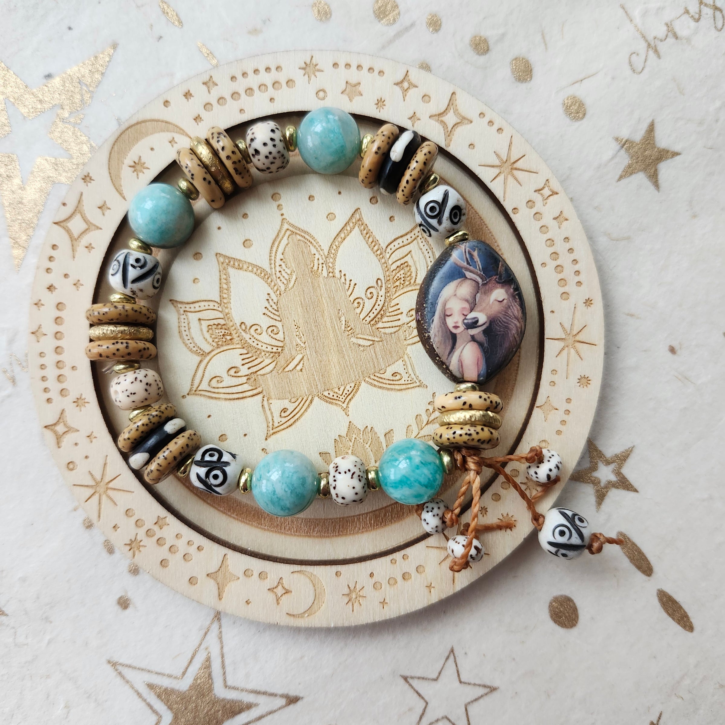 Featuring soothing Amazonite gemstones paired with sacred Bodhi seed beads, carved bone beads, shimmering gold-toned Heishi beads, and a unique artisan ceramic focal piece, each element tells its own magical story.